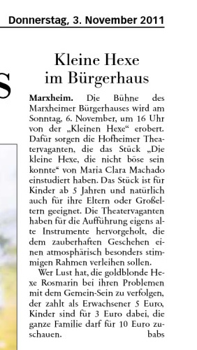 Die zweite Aufführung unseres Kinderstückes „die kleine Hexe die nicht böse sein konnte“ war auch für uns eine kleine Premiere. Anders als im Kellereigebäude durften wir im neuen Bürgerhaus Marxheim eine große Bühne unsicher machen. Was dabei heraus kam hätten wir nicht besser zusammen fassen können als Michelle Spillner vom Höchster Kreisblatt: